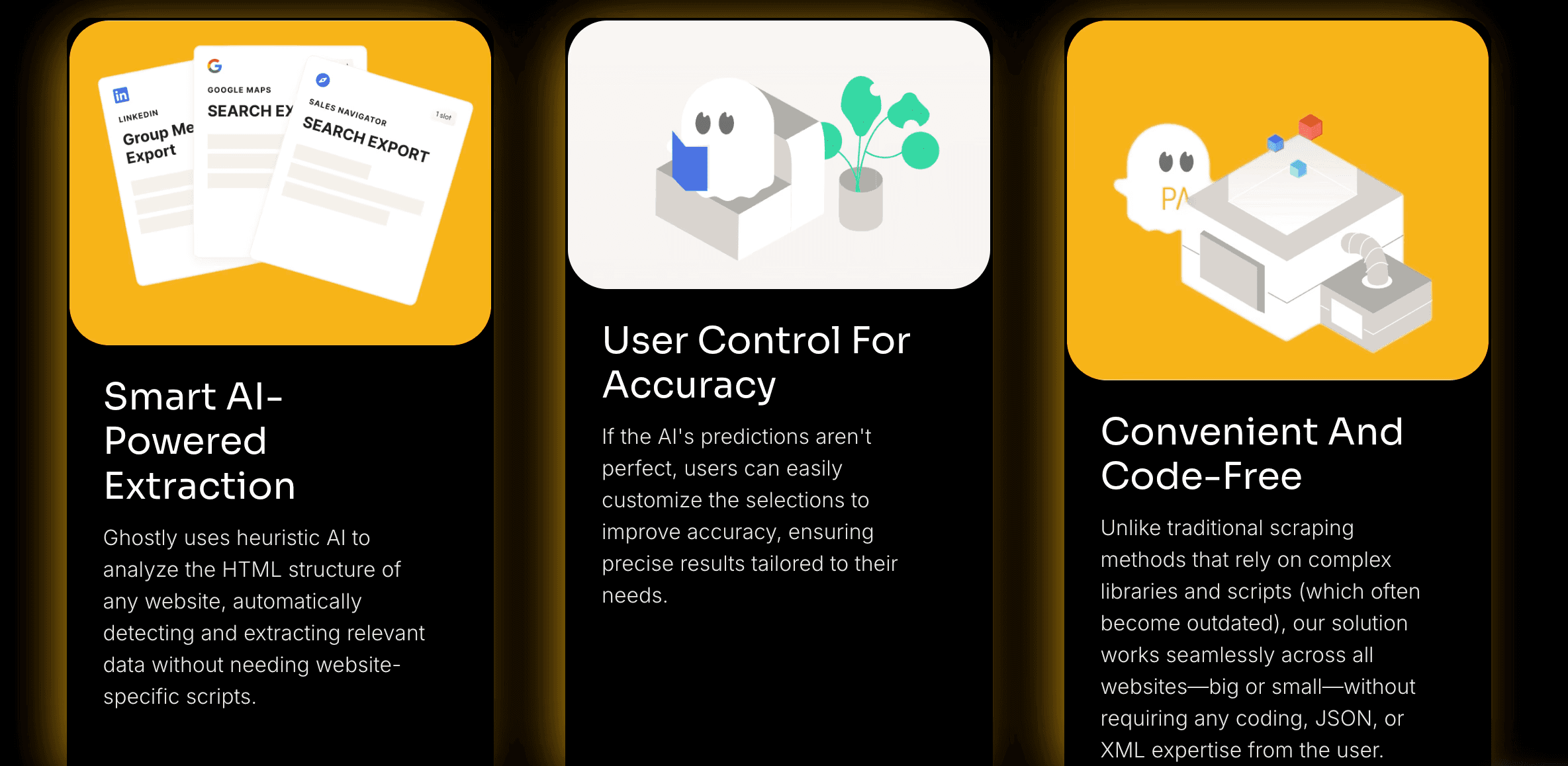 Ghostly uses AI to detect and extract data, supports dynamic content loading, and offers customizable delays for crawling. It handles pagination, infinite scrolling, and provides a preview with copy-paste functionality. Extracted data can be exported to Excel or CSV, with options for column renaming and filtering. No coding required!